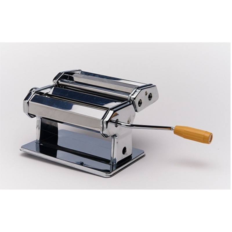 Μηχανή Ζύμης/Φύλλου- Ζυμαρικών. Ιδανική για να παρασκευάζετε στο σπίτι σας φύλλο ζύμης για πίτες και γλυκά όπως οι δίπλες, και ζυμαρικά όπως μακαρόνια, lasagne, tagliolini και fettuccine. Για το φύλλο ζύμης υπάρχει δυνατότητα να διαλέγετε το πάχος της ζύμης που σας εξυπηρετεί, από 0,3 ως 2,5 χιλιοστά πάχος και πλάτους 15 εκ. Το άνοιγμα μεταξύ των κυλίνδρων ελέγχεται από ρυθμιστή με 9 θέσεις για ποικιλία σε πάχος της ζύμης. Η μηχανή είναι διπλή και αποσπώμενη σε δυο κομμάτια για ευκολότερο καθάρισμα και φύλαξη , και περιλαμβάνει σφιγκτήρα για να σταθεροποιηθεί στο τραπέζι σας και μανιβέλα.
